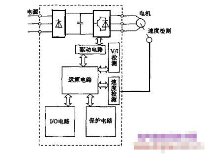 在圖 1點(diǎn)劃線內(nèi),無(wú)速度檢測(cè)電路為開(kāi)環(huán)控制。在控制電路增加了速度檢測(cè)電路,即增加速度指令,可以對(duì)異步電動(dòng)機(jī)的速度進(jìn)行控制更精確的閉環(huán)控制。
