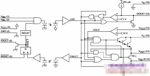 在剛剛上電的過(guò)程中,芯片供電電壓由0V逐漸上升到最大值。如果此時(shí)芯片有輸出會(huì)造成IGBT門極電壓過(guò)低,那么它會(huì)工作在線性放大區(qū)。HCPL316J芯片的欠壓鎖定保護(hù)的功能(UVLO)可以解決此問(wèn)題。當(dāng)VCC與VE之間的電壓值小于12V時(shí),輸出低電平,以防止IGBT工作在線性工作區(qū)造成發(fā)熱過(guò)多進(jìn)而燒毀。示意圖詳見(jiàn)圖1中含UVLO部分。