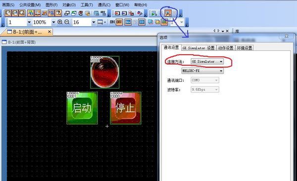 把三菱PLC程序和觸摸屏內(nèi)容編好,先把三菱PLC編程軟件仿真打開再打開觸摸屏軟件仿真(注意:打開觸摸屏軟件仿真之前要先把連接方式設(shè)置成“GX Simulator”,設(shè)置方法如下圖。)