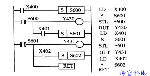 圖1 -11 所示,當(dāng)觸頭 X400 閉合時,狀態(tài)器S600 得電并內(nèi)部自鎖,其步進(jìn)輸出觸頭